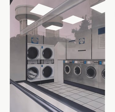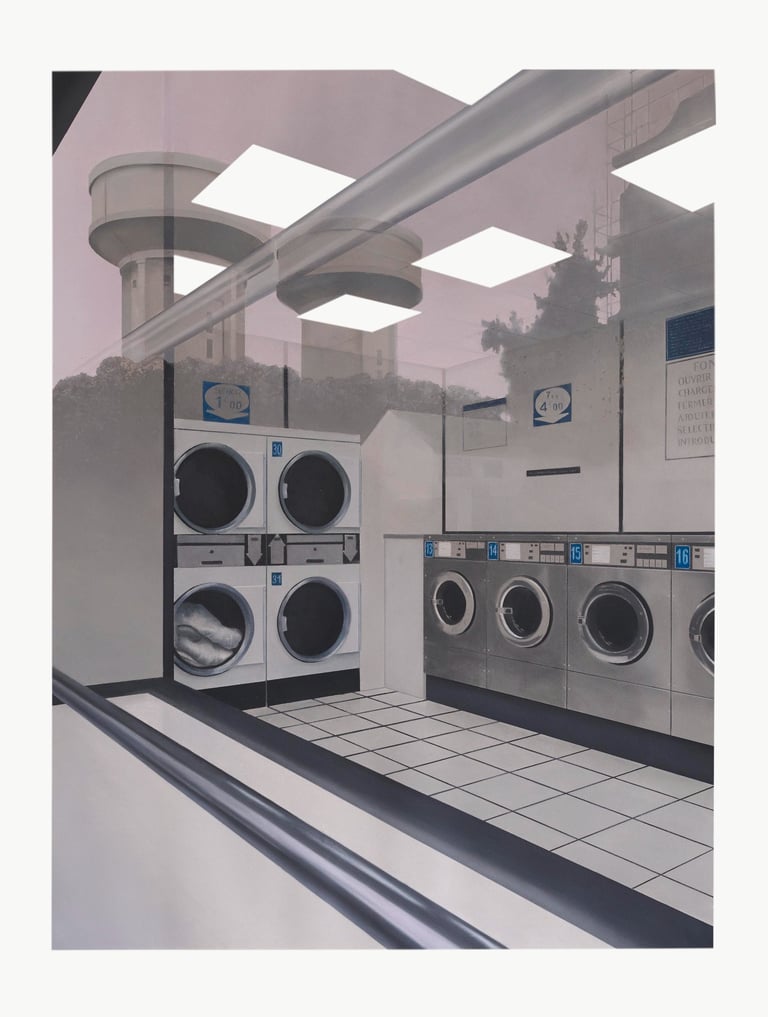 Dans ce grand dessin au pastel, écho contemporain aux blanchisseuses de Edgar Degas, les machines se sont substituées aux travailleuses. Reste un espace impersonnel et standardisé, dont l’esthétique fonctionnelle semble régie par les lois de rentabilité d’une économie déshumanisée.