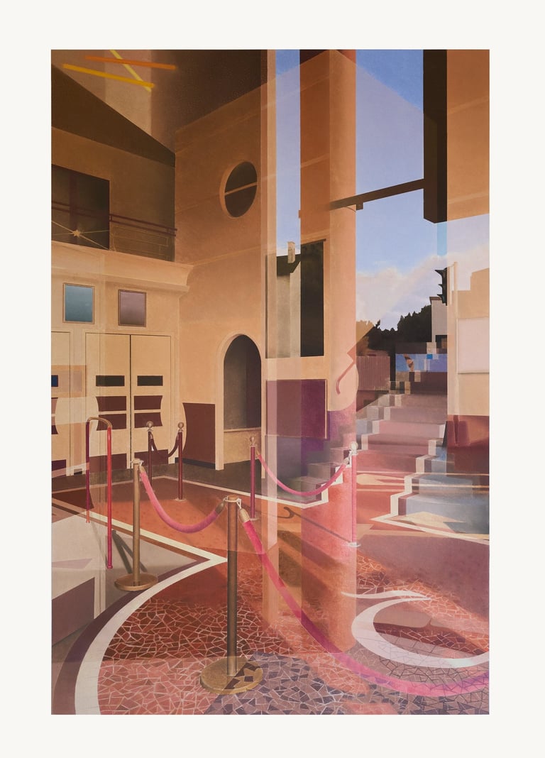 Ce dessin représente l’intérieur d’un cinéma. L’espace est vide, structuré par les cordons de circulation, les marches et les volumes architecturaux qui organisent le regard dans une composition géométrique traversée de reflets.